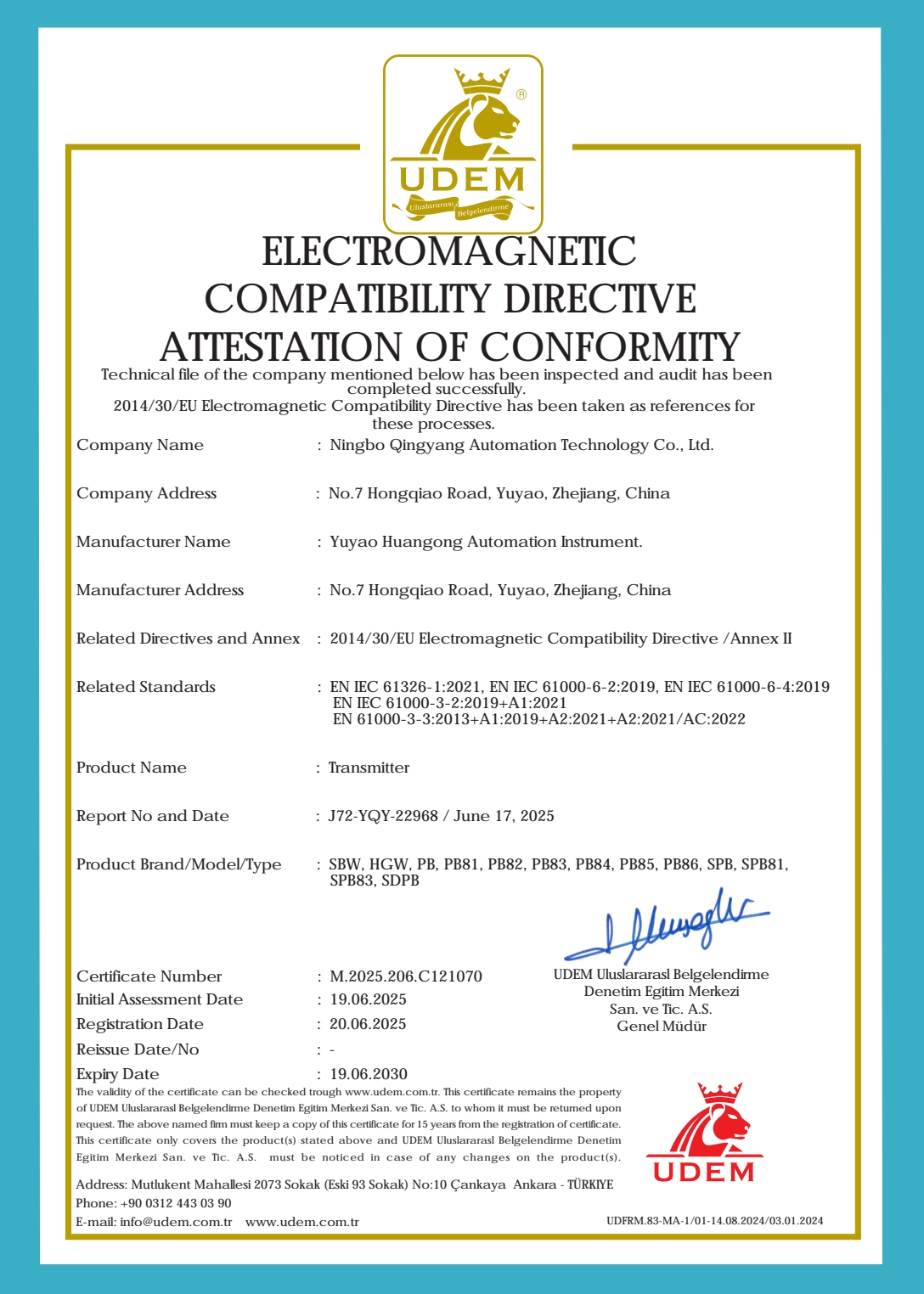 Numele certificatului: 电磁兼容性指令 符合性声明